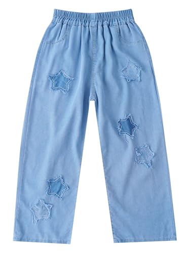 Aislor Kids Girls Star Patches Elastic Waist Casual Wide Leg Denim Jeans Pants Washed Vintage Trousers with Pockets 6