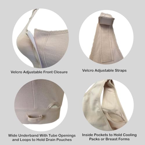 • The Bra Center Front is adustable by Velcro. And the Wide Straps are adjustable by Velcro. There are two Inside Pockets in the bra, in which you could place ice or cooling packs to ensureyou stay comfortable through the healing process.