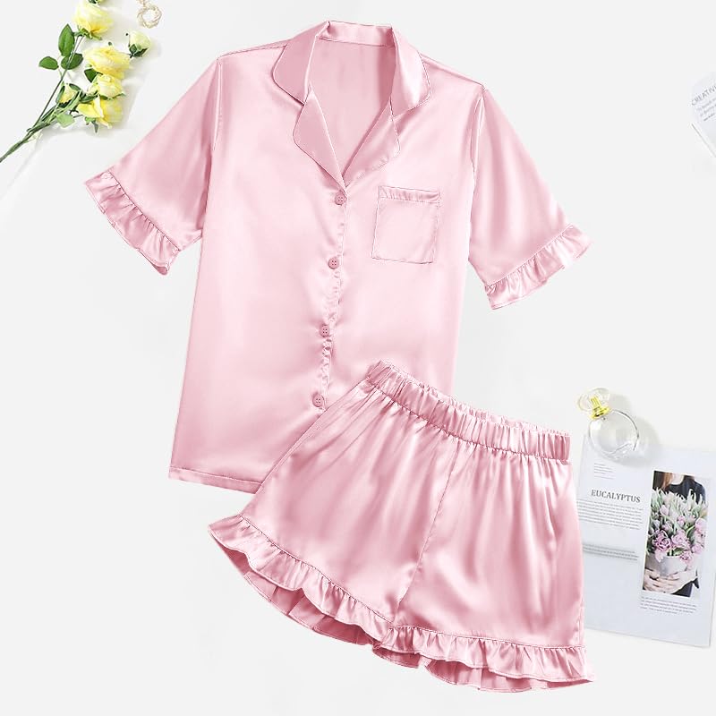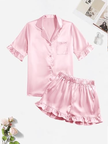 Umenlele Women's Satin Silky Collar V Neck Ruffle Short Sleeve Top and Shorts Sleepwear PJs Pajamas Set 1