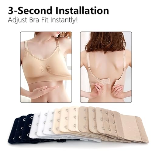 • 12 Pieces Bra Extender Set - This set includes 12 bra extenders, each measuring 3.8" long x 2.2" wide, with a hook distance of 3/4". They are compatible with most three-row, three-hook bras. The set comes in four classic colors: black, white, nude, and beige, making it easy to match with various outfits.