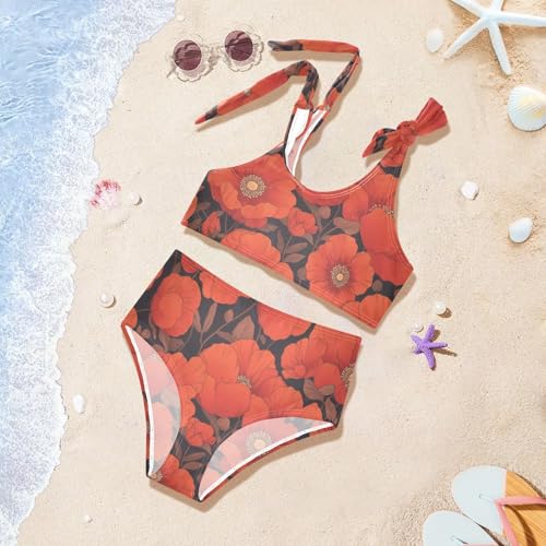 Vibrant Floral Pattern Poppy Girls Two Piece Kids Bikini Set Scoop Neck Bathing Suit Swimwear Adjustable Shoulder Strap 2