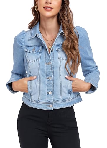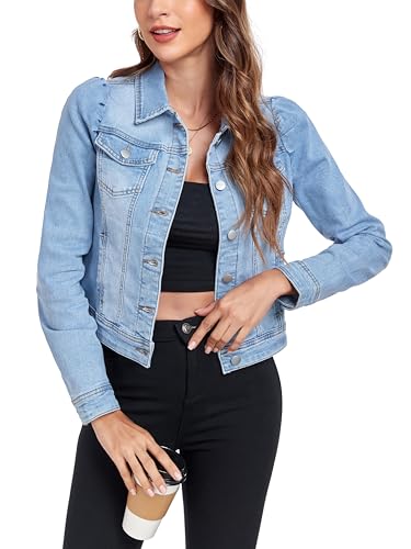 HOT ! Anienaya Women's Jean Jacket Cropped Denim Jackets Stretchy Puff Long Sleeve Ripped with Pockets