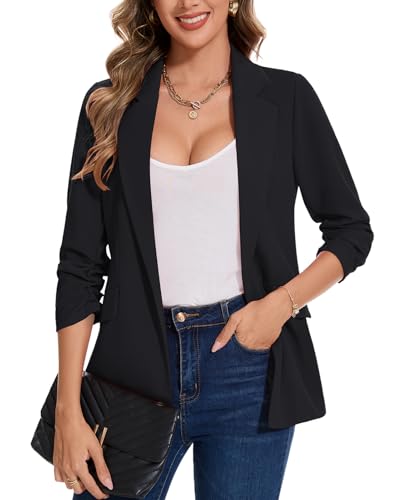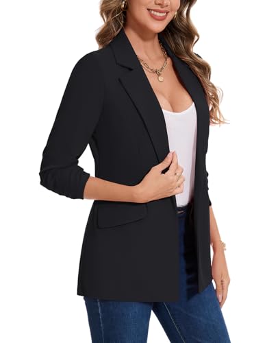 HOT ! MINTLIMIT Blazer for Women Open Front 3/4 Ruched Sleeve Suit Jacket Notched Collar Casual Work Office Blazers with Pockets