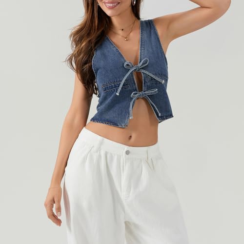Women Sexy Denim Vest Deep V Neck Tie Up Front Sleeveless Jean Tank Top Low Cut Tight Fit Fashion Cropped Vest 5