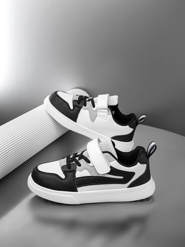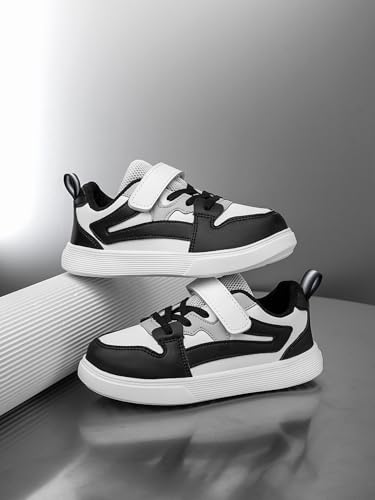 Boys and Girls Board Shoes Adjustable Hook and Loop Classic Low Top Kids Sneakers for All Season Black Grey White 6